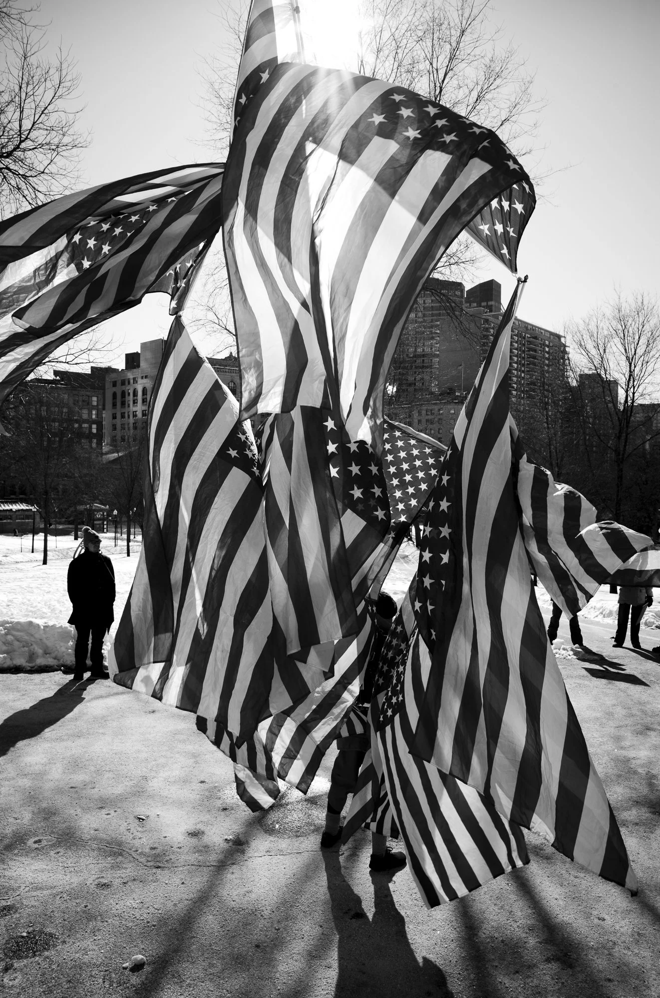 I like the two images at the bottom of this page. While I made several images of the flag carrier, this one obscures the subject enough to leave some questions. The photo of the flag-draped trumpeter is removed from the context of the surrounding demonstration, making it an unusual scene, and one that begs for narrative. The person near the trumpet’s bell adds visual interest and plays with scale.